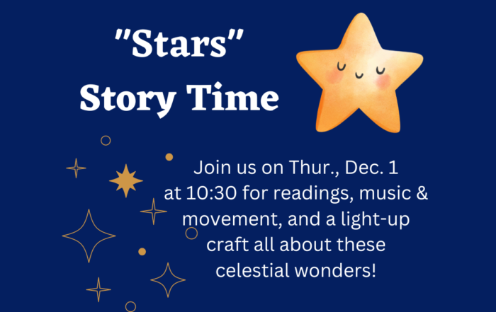 Ms. Shelley is kicking off December with a stars-themed story time this Thursday, December 1 at 10:30. Bring your little ones for an interactive and engaging experience where we will talk about stars through [...]