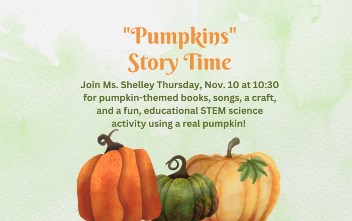 Join Ms. Shelley Thursday, Nov. 10 at 10:30 for pumpkin-themed books, songs, a craft, and a fun, educational STEM science activity using a real pumpkin!