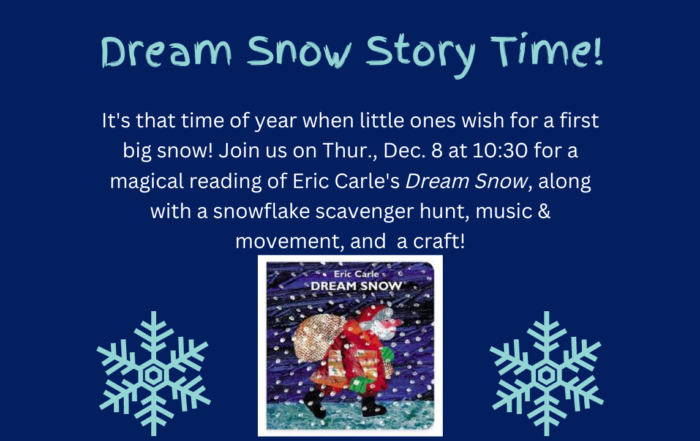 It's that time of year when little ones wish for a first big snow! Join Ms. Shelley on Thursday, December 8th at 10:30am for a magical reading of Eric Carle's Dream Snow, along with [...]
